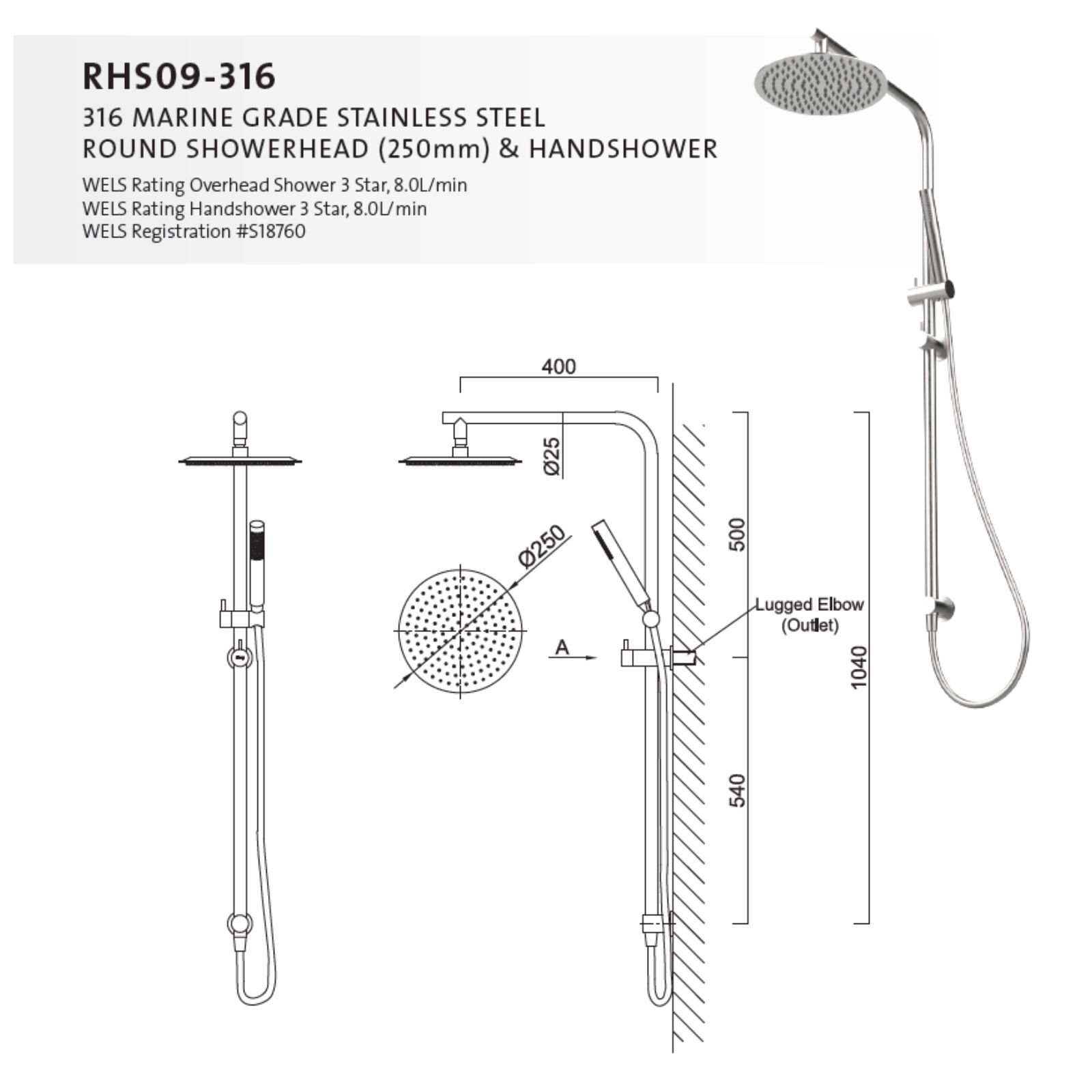 316 Marine Grade Stainless Steel Round Showerhead (250mm) & Handshower - RHS09-316
