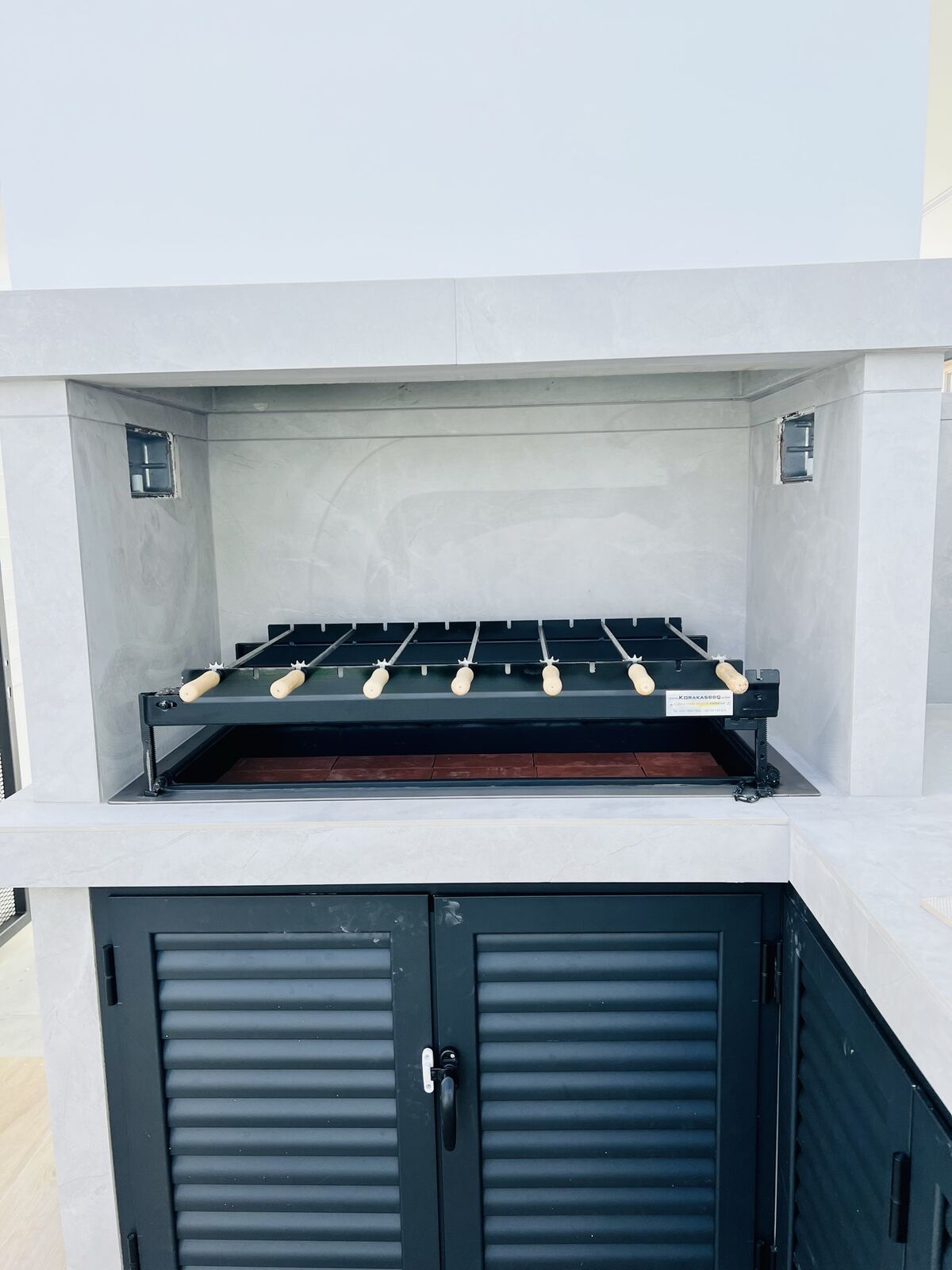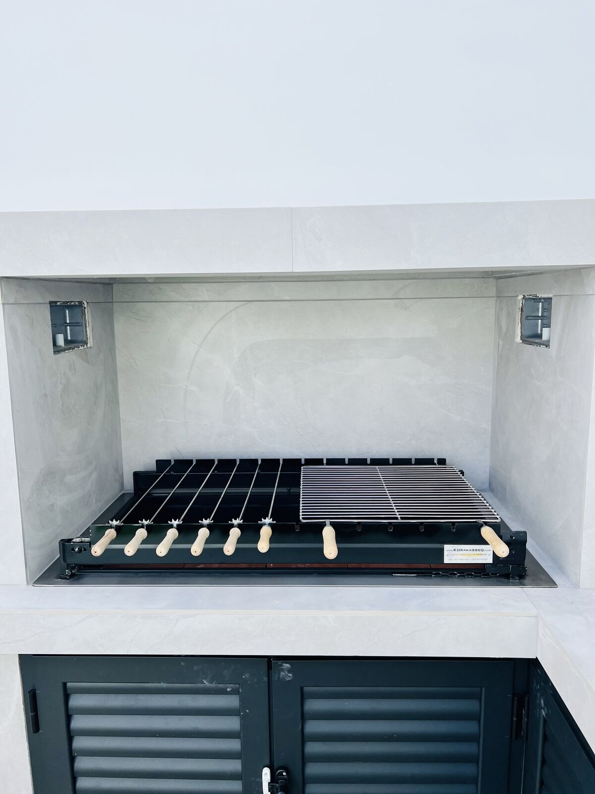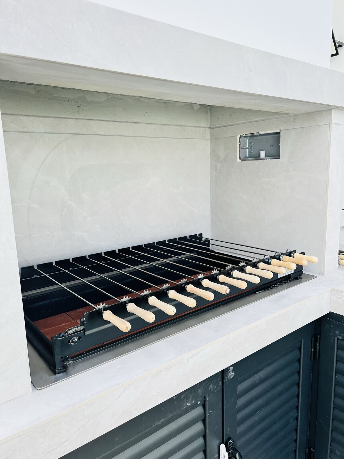 This Cyprus grill chain drive includes a very powerful and efficient chain driven mechanism for up to 13 spits. The mechanism operates silent and efficient and can be installed into or on top of the bench. The Motor (Not Included by Default) is inserted on the same side as spits and skewers. This saves space. The capacity can be estimated to 15-20 Kg of meat. Length of the chain drive mechanism: 85 cm. Distance skewer to skewer: 55 mm. When it comes to built in chain drive charcoal grills you won't get a better value than the CG-9000, with it's huge charcoal cooking area of 4560 cm2 95cm x 48cm. Height adjustable to give you different cooking positions that allow optimal performance.