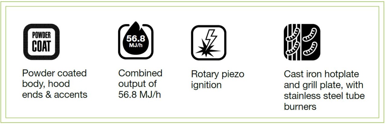 Lighting up is a breeze with the reliable rotary piezo ignition system, and the spacious cooking area features cast iron grills and hotplates for even heat distribution. A stainless steel warming rack keeps your food perfectly timed and ready to serve.