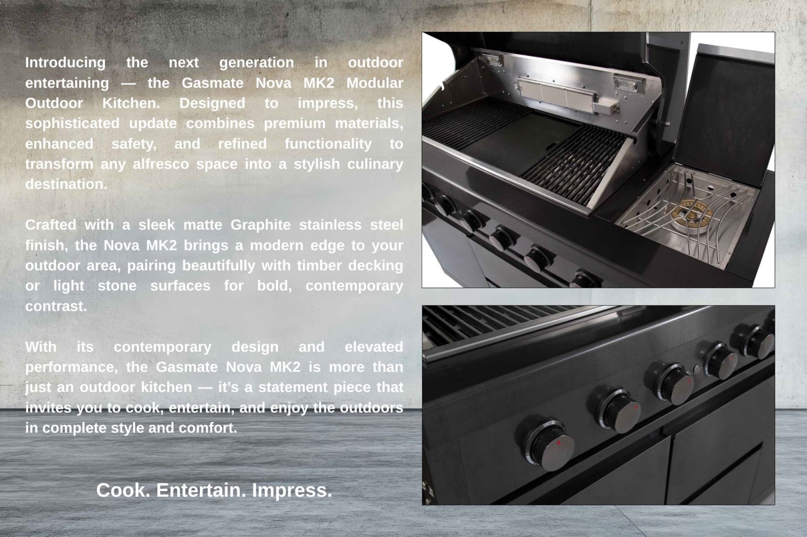 Introducing the next generation in outdoor entertaining — the Gasmate Nova MK2 Modular Outdoor Kitchen. Designed to impress, this sophisticated update combines premium materials, enhanced safety, and refined functionality to transform any alfresco space into a stylish culinary destination.
