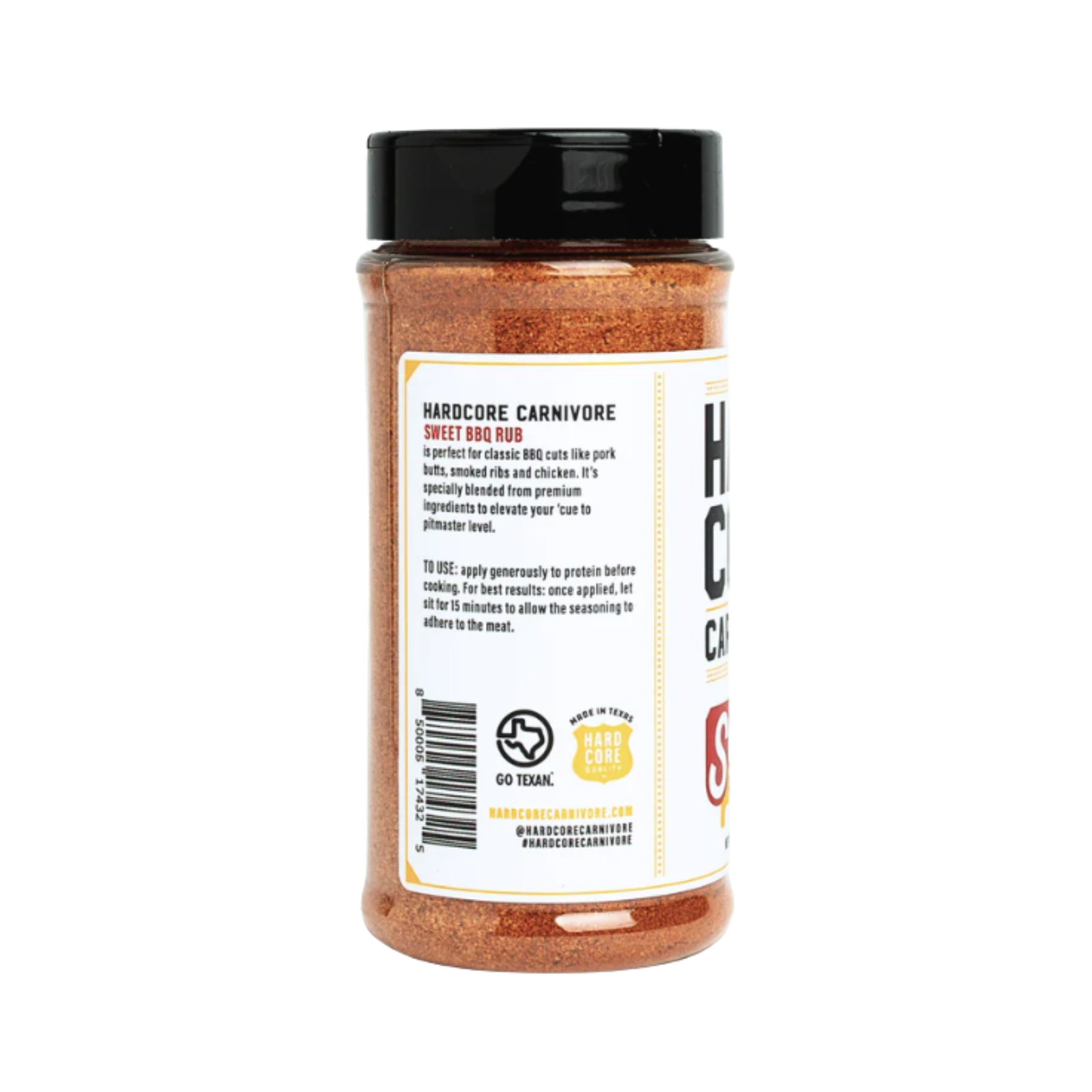 Hardcore Carnivore Sweet BBQ rub is perfect for classic BBQ cuts like pork butts, smoked ribs, and chicken. It’s specially blended from premium ingredients to elevate your ‘cue to pitmaster level. To use- apply generously to protein before cooking. For best results: once applied, let sit for 15 minutes to allow the seasoning to adhere to the meat.