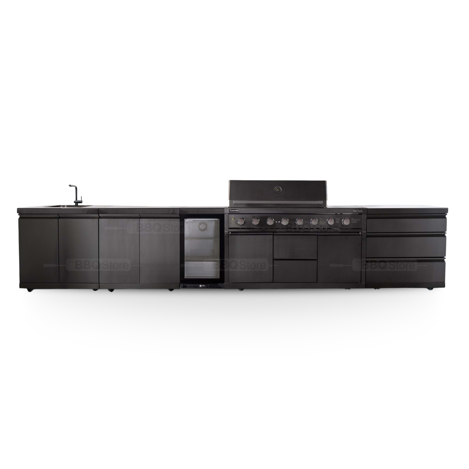 LPG Gasmate Nova MK2 Graphite Outdoor Kitchen with Drawers, Sink, BBQ, Single Door Fridge + Top and Storage - BQ29F-LPG1DFR-BUN