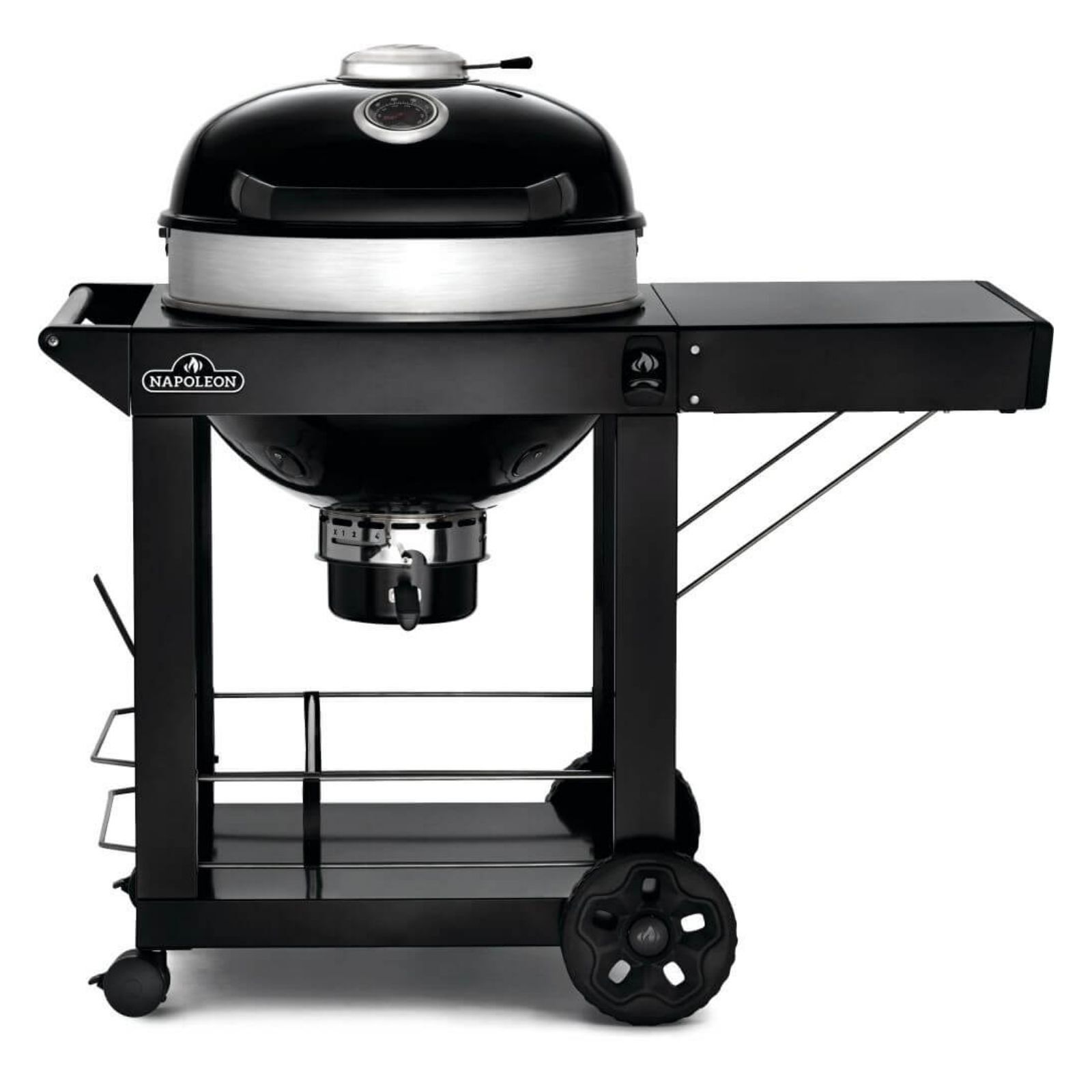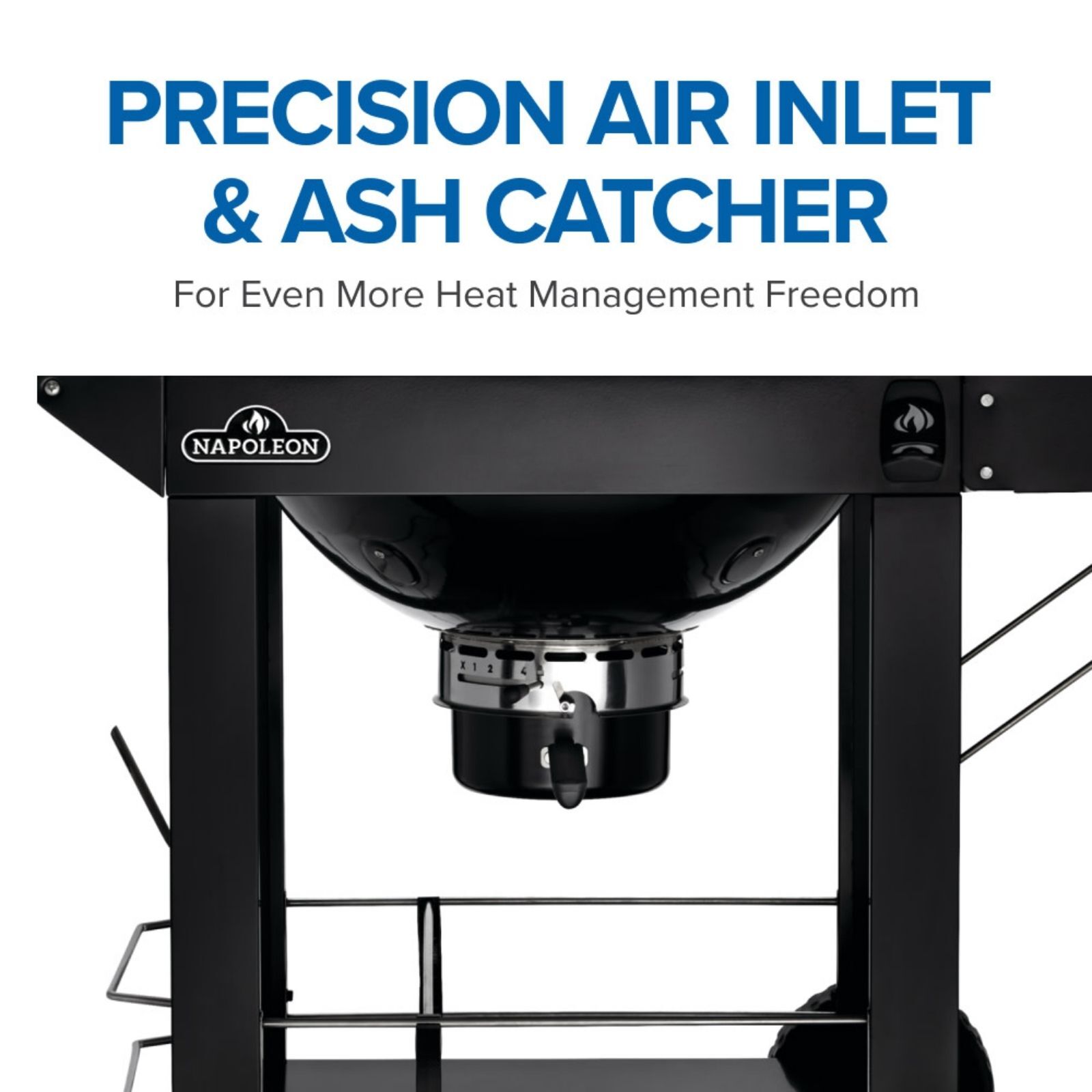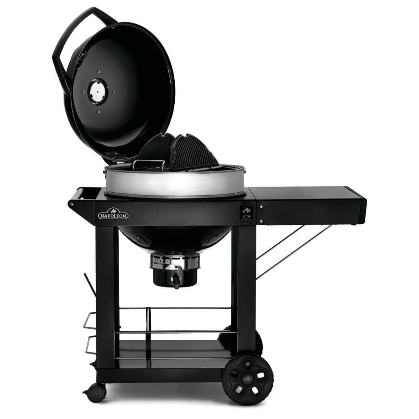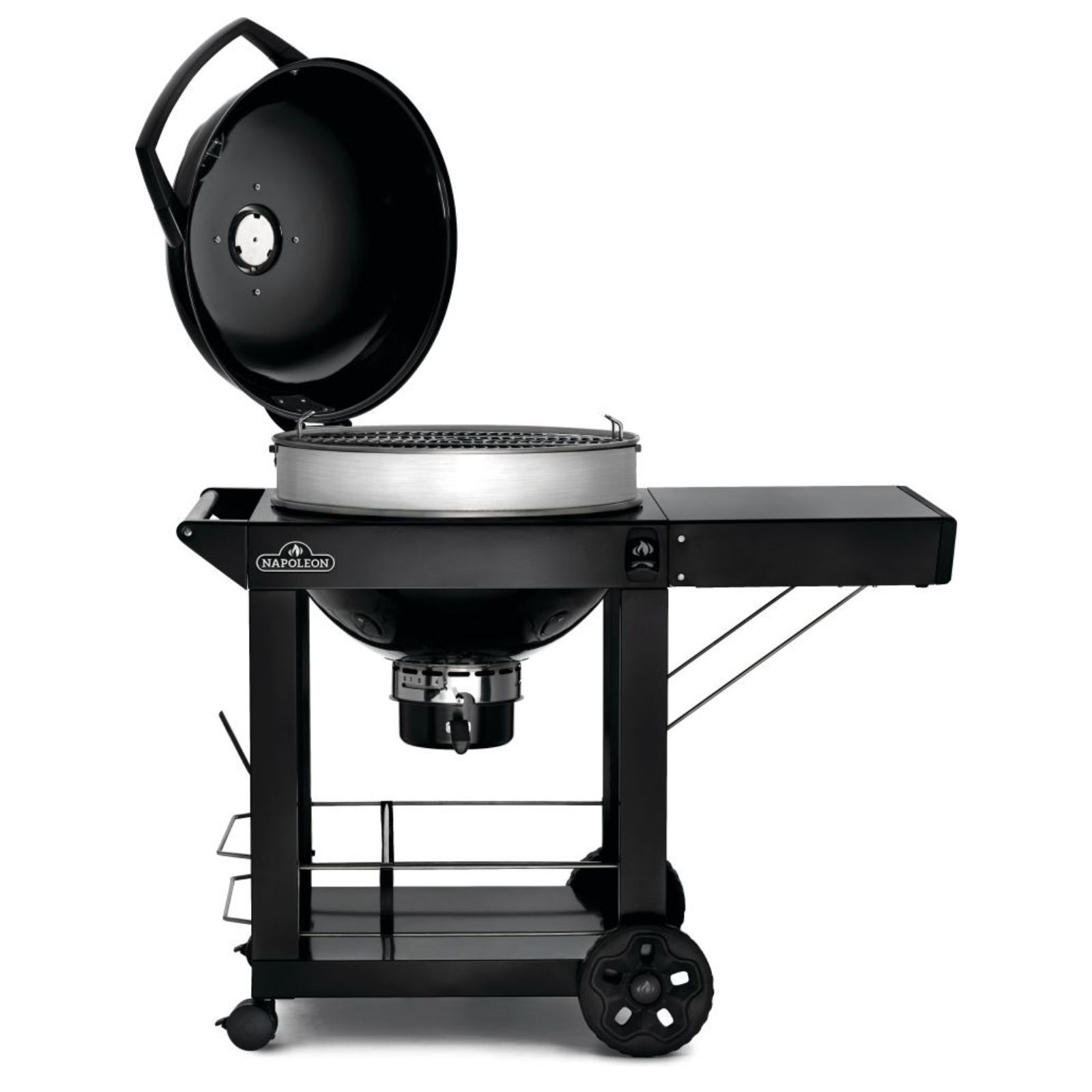 Enjoy full-sized charcoal grilling with the Napoleon PRO 22" Kettle Grill and Cart. This mobile setup features a powder-coated cart with a folding side shelf for extra prep space. Adjustable, hinged cast iron grids allow for easy charcoal access and precise cooking. The Vortex heat system boosts airflow and fuel efficiency, while the Smoke Stack Chimney ensures reliable temperature control—even in wind and rain. It’s rotisserie-ready with a stainless steel extension ring and integrated ports, plus storage hooks and holders keep tools within reach. Built for charcoal lovers who want convenience without compromise.