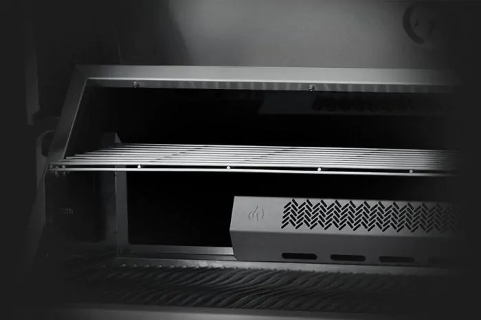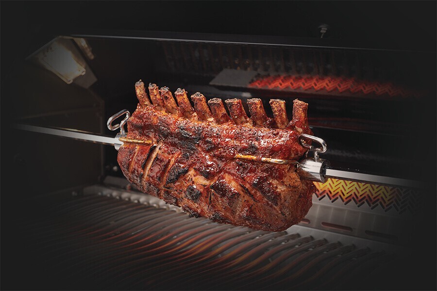 | Infrared heat from the dual rotisserie burners are perfect for high heat searing and slow spit roasting. | |