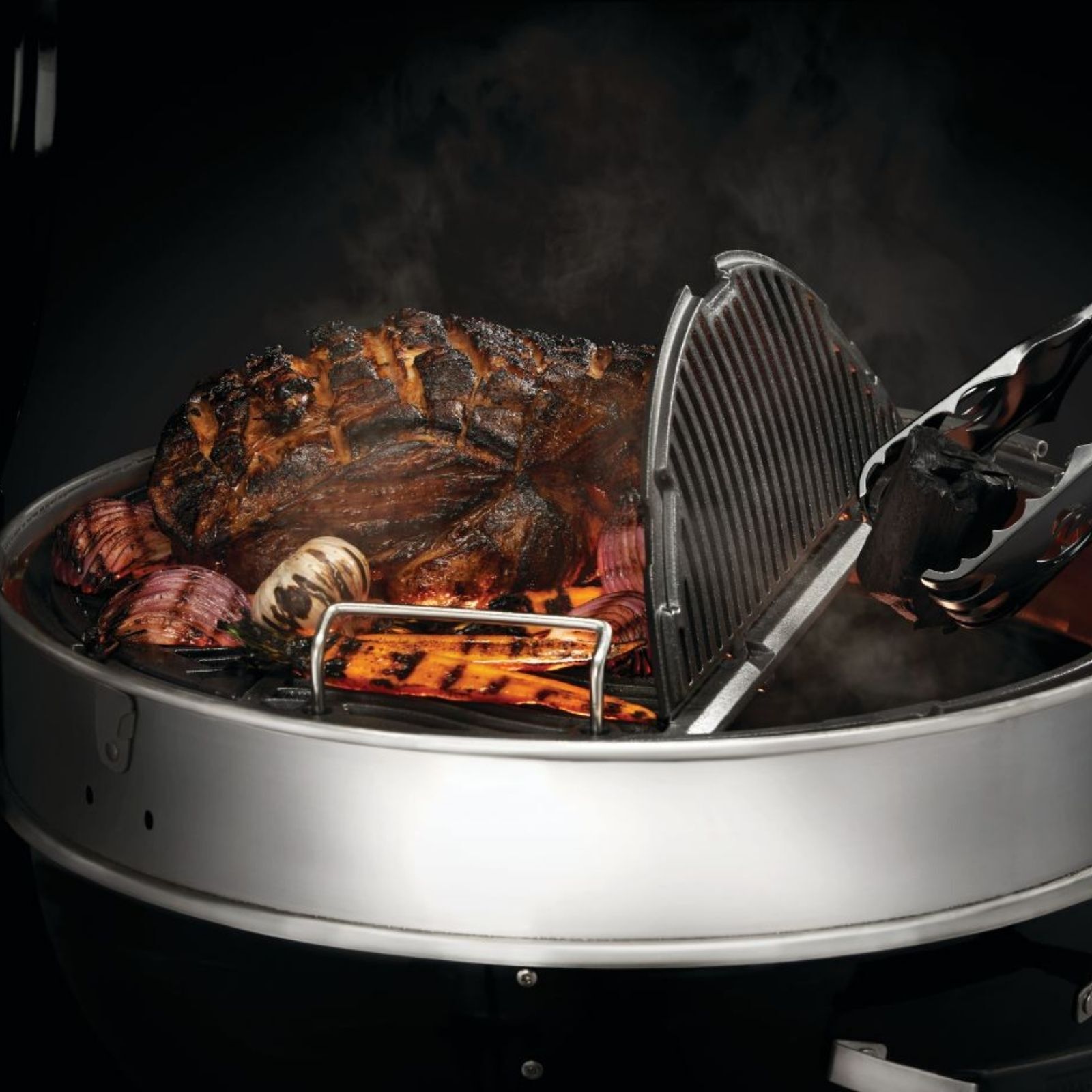 The cast iron grids hold heat and provide the best searing, they are hinged to allow easy addition of extra charcoal, refilling water pans, and addition of wood for smoking | |