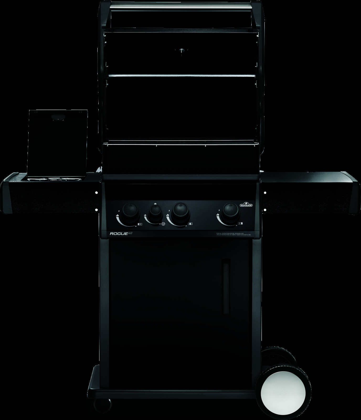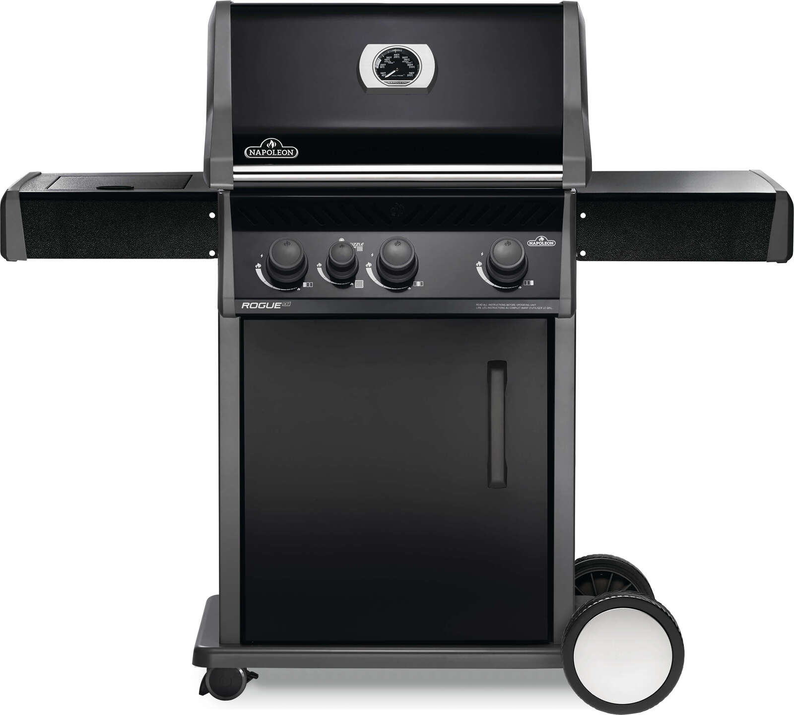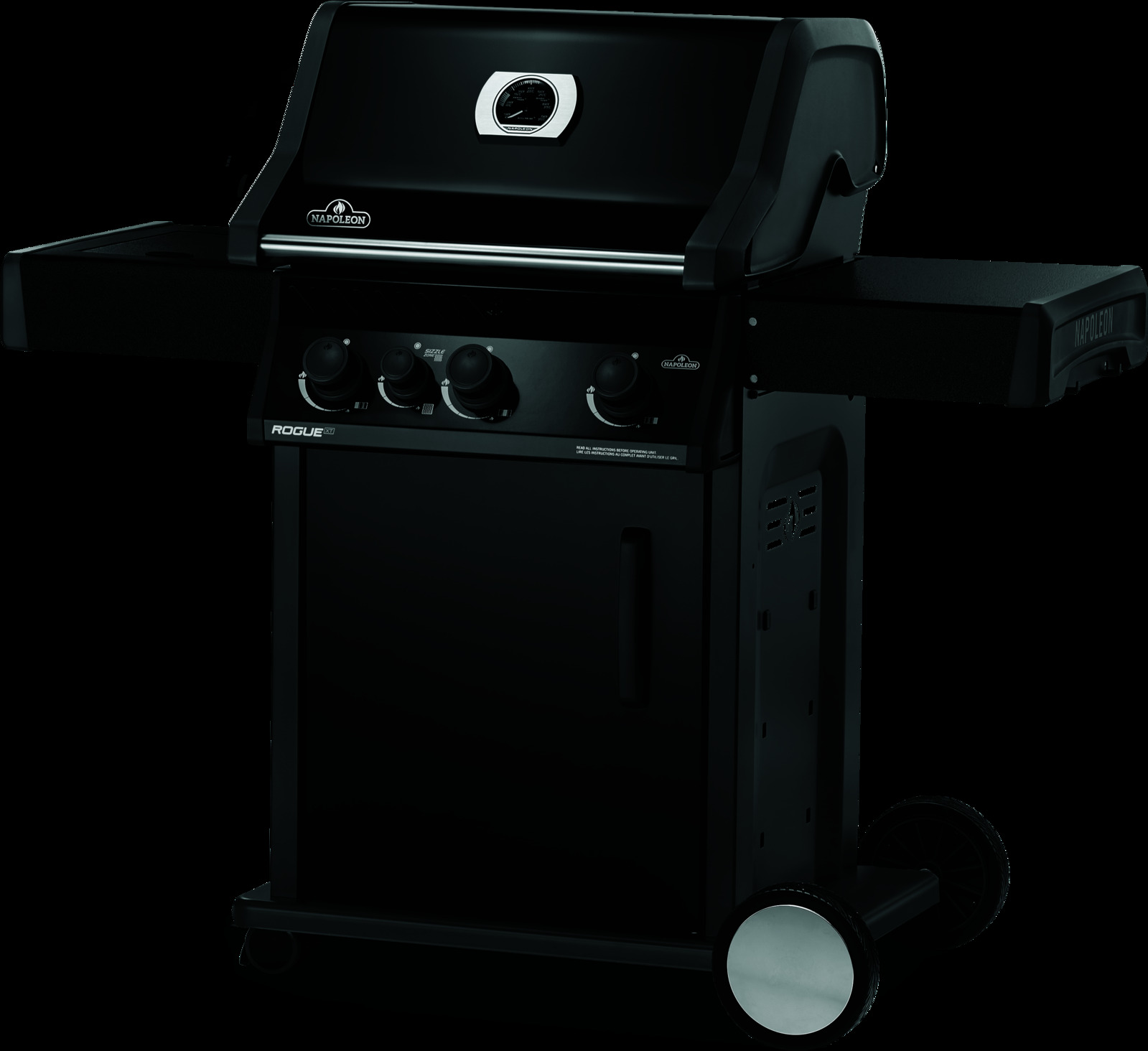Napoleon's Rogue® XT 425 Black Hood Natural Gas Grill with Infrared Side Burner has three burners, cast iron grids and a high top lid. This grill lights easily, every time, with a battery-free ignition. Grill the perfect steak using the integrated sizzle zone side burner or use it to make sauces and sides while grilling, and searing on the main area. The durable materials are both stylish and easy to maintain.