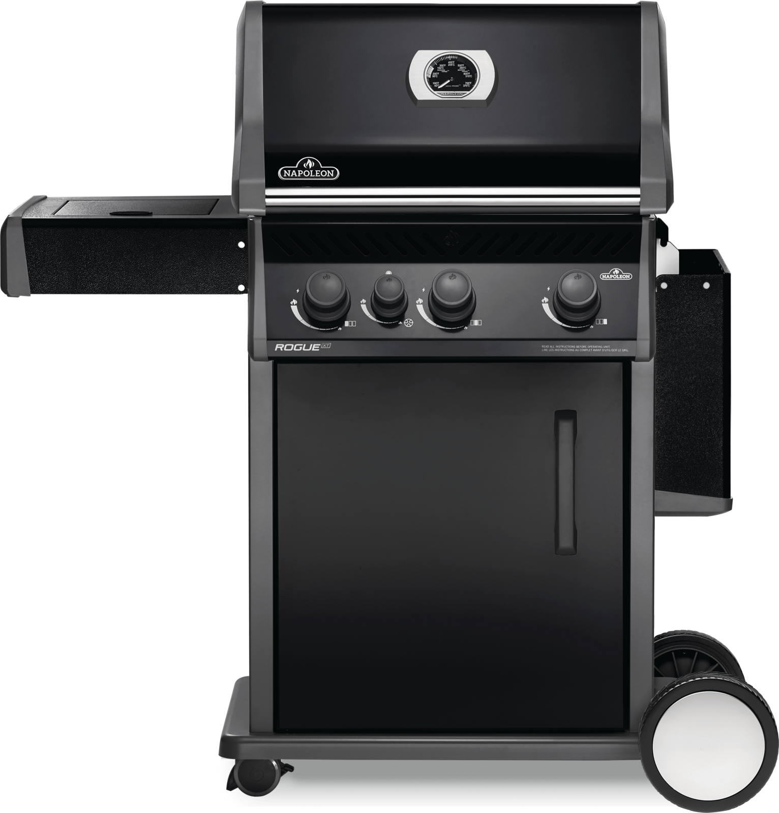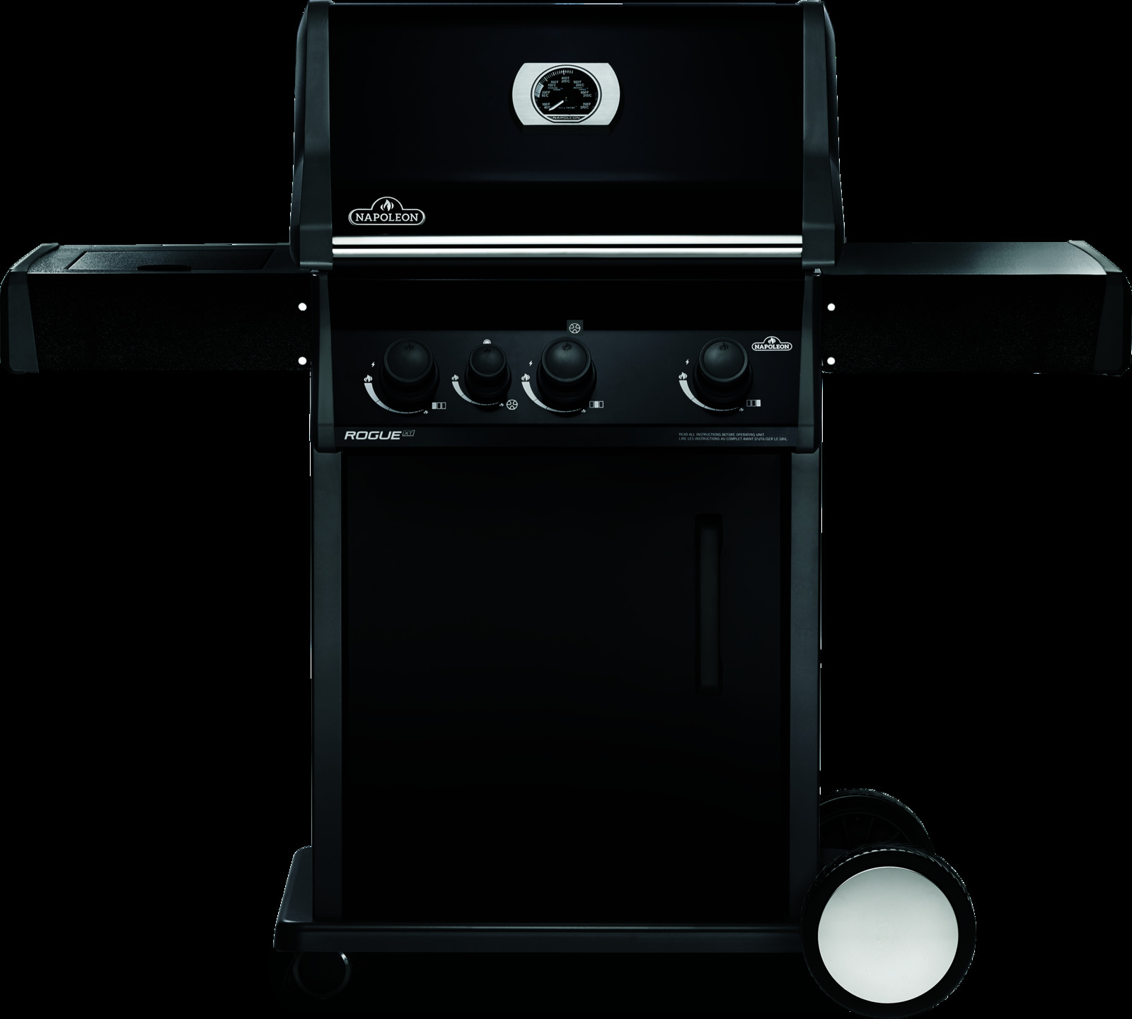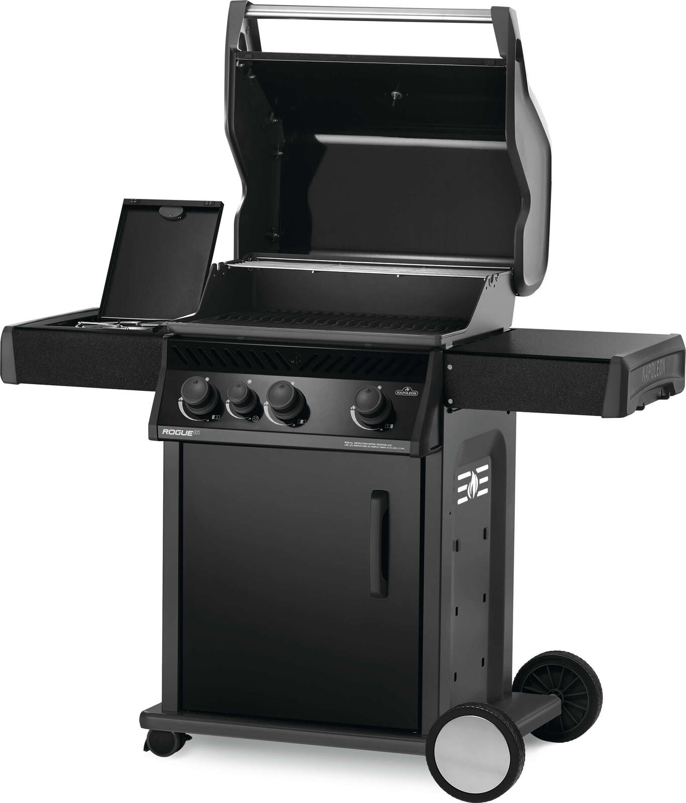 Napoleon's Rogue® XT 425 Black Hood Natural Gas Grill with Infrared Side Burner has three burners, cast iron grids and a high top lid. This grill lights easily, every time, with a battery-free ignition. Grill the perfect steak using the integrated sizzle zone side burner or use it to make sauces and sides while grilling, and searing on the main area. The durable materials are both stylish and easy to maintain.