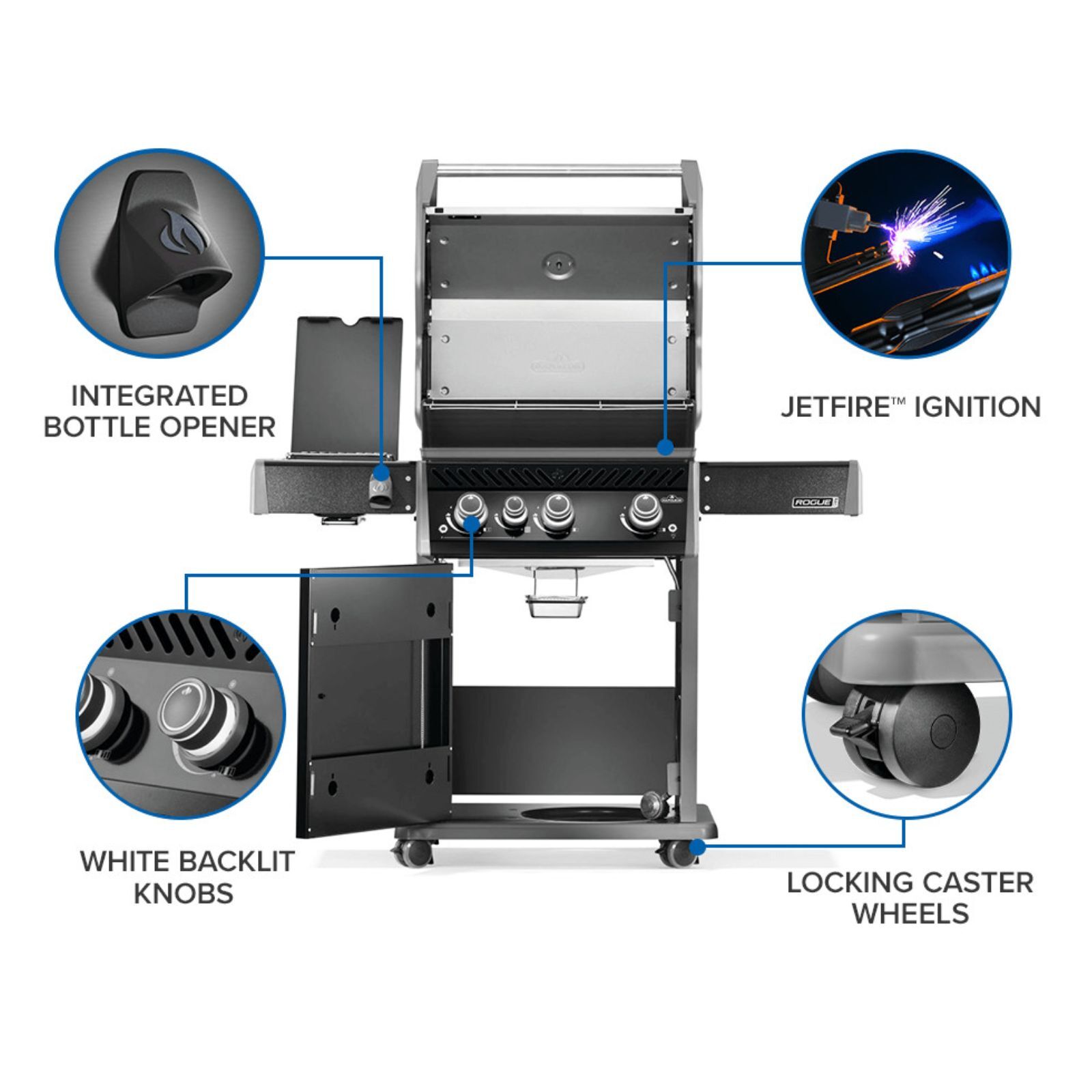 Elevate your backyard barbecue with the Napoleon Rogue® PRO 425 in sleek Sizzle Black. Designed for serious grillers, this propane gas grill delivers performance and versatility with three powerful main burners and an integrated infrared side burner—perfect for achieving that steakhouse-quality sear.